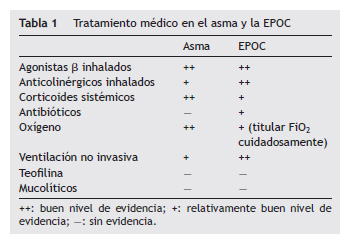 Junto con el soporte ventilatorio, debe comenzarse inmediatamente tratamiento médico (Tabla 1). Debe administrarse O2 para corregir la hipoxemia en el asma agudo, así como en la EPOC, si bien en este caso es fundamental prevenir el aumento de la pCO2 y la consiguiente narcosis hipercápnica, por lo que la titulación de la FiO2 es esencial2, no sobrepasando una SaO2 del 90%. Si alcanzando este objetivo se produce un empeoramiento de la acidosis respiratoria, estamos ante una clara indicación de soporte ventilatorio3. Una vez iniciado dicho soporte, conviene efectuar un diagnóstico diferencial de las posibles causas de fracaso respiratorio (p. ej., tromboembolia pulmonar, neumotórax, obstrucción de vía aérea superior, etc.), así como identificar el desencadenante etiológico del episodio. Conviene recordar que la insuficiencia cardiaca (especialmente derecha) se halla presente con frecuencia en la EPOC descompensada.
