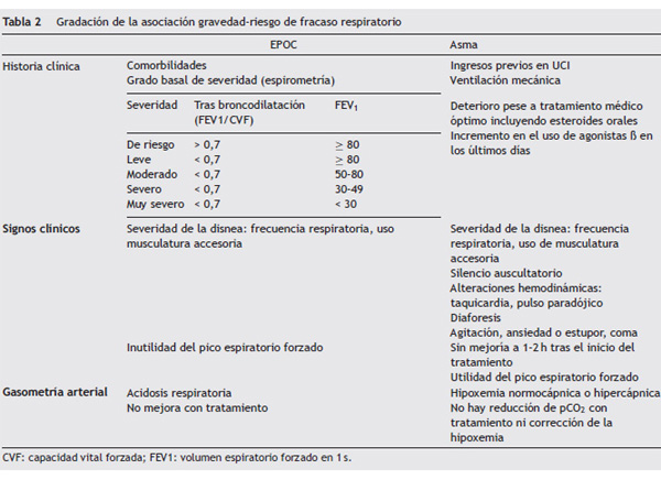 - La respuesta inicial al tratamiento en el asma es un importante factor pronóstico. Si el paciente no mejora clínica, fisiológica (gasometría) y mecánicamente (PEFR) en un plazo de 1-2 h, debe plantearse el soporte ventilatorio, y es imprescindible reevaluar al paciente (inicialmente cada hora)5. En la EPOC, no existe la misma significación pronóstica que en el asma, pues la respuesta al tratamiento es más lenta. Estos conceptos se resumen en la Tabla 2.