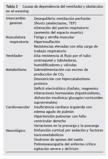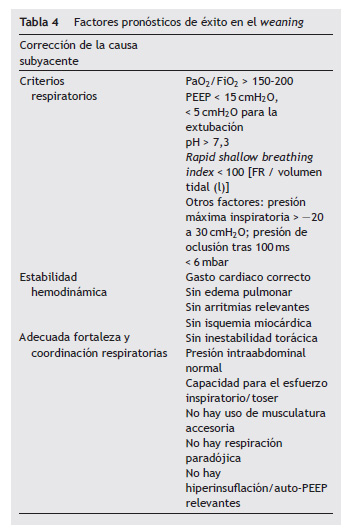 La ventilación mecánica se asocia a numerosos efectos secundarios, por lo que es aconsejable iniciar el destete lo más precozmente posible, especialmente en la EPOC. Para valorar el momento de inicio adecuado, deberemos tener en cuenta las posibles causas de dependencia del ventilador y dificultades durante el weaning (Tabla 3), así como los factores que permiten predecir un destete exitoso (Tabla 4). Cabe destacar que, especialmente en la EPOC y en situaciones difíciles, se recomienda el empleo de la ventilación mecánica no invasiva tras la extubación para evitar la reintubación37-39.