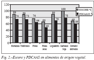 El escore de una proteína refleja su contenido en aminoácidos (AA) en comparación con la proteína ideal. Sin embargo, cuando se necesita conocer la utilización de los AA en el organismo es necesario realizar la corrección del valor de escore según la digestibilidad proteica (PDCAAS). Debido a que tal información no se encuentra disponible para los alimentos de consumo habitual, el presente trabajo tuvo como objetivo calcular en los mismos el valor de PDCAAS. El escore de una proteína refleja su contenido en aminoácidos (AA) en comparación con la proteína ideal. Sin embargo, cuando se necesita conocer la utilización de los AA en el organismo es necesario realizar la corrección del valor de escore según la digestibilidad proteica (PDCAAS). Debido a que tal información no se encuentra disponible para los alimentos de consumo habitual, el presente trabajo tuvo como objetivo calcular en los mismos el valor de PDCAAS. El escore se obtuvo calculando el AA limitante en 70 alimentos, tomando como proteína de referencia el patrón de aminoácidos para niños > de 1 año y adultos propuesto por la Academia Nacional de Ciencias EEUU en el año 2002. El valor de PDCAAS se obtuvo en cada caso multiplicando el dato de el escore por la cifra de digestibilidad. En los alimentos de origen vegetal, los valores obtenidos de escore y PDCAAS fueron respectivamente: hortalizas del 88,5% / 73,4%, tubérculos 89,44% / 74,24%, frutas frescas: 75,6% / 64,3%, frutas secas: 65,6% / 48,1, legumbres en general: 89,2% / 69,58%, garbanzos y soja: 100% / 78%, cereales y derivados: 68,8% / 58,5%.El escore se obtuvo calculando el AA limitante en 70 alimentos, tomando como proteína de referencia el patrón de aminoácidos para niños > de 1 año y adultos propuesto por la Academia Nacional de Ciencias EEUU en el año 2002. El valor de PDCAAS se obtuvo en cada caso multiplicando el dato de el escore por la cifra de digestibilidad. En los alimentos de origen vegetal, los valores obtenidos de escore y PDCAAS fueron respectivamente: hortalizas del 88,5% / 73,4%, tubércupalos 89,44% / 74,24%, frutas frescas: 75,6% / 64,3%, frutas secas: 65,6% / 48,1, legumbres en general: 89,2% / 69,58%, garbanzos y soja: 100% / 78%, cereales y derivados: 68,8% / 58,5%. La confección de una tabla que contenga los valores de escore, digestibilidad y PDCAAS de alimentos constituye un aporte de utilidad cuando se desea seleccionar alimentos en un plan de alimentación en función de su calidad proteica.