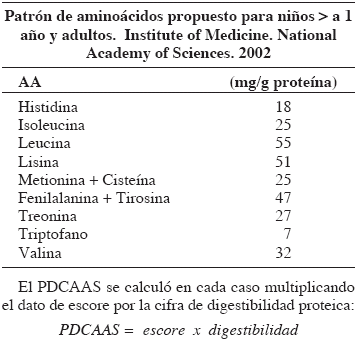 El escore de cada alimento fue calculado teniendo en cuenta datos bibliográficos de composición química de aminoácidos esenciales de las tablas de FAO9. Se utilizó como proteína de referencia el patrón de aminoácidos para niños mayores de 1 año y adultos de la Academia Nacional de Ciencia de EEUU.