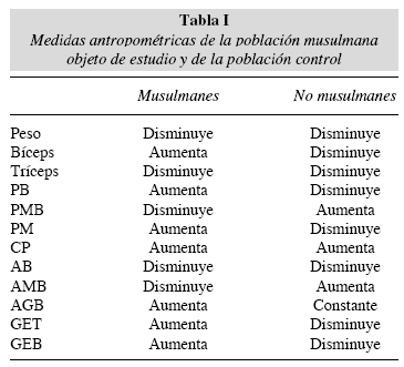Se encontraron diferencias significativas al comparar estas medidas (tabla I) con las del grupo no musulmán, donde el AGB se mantuvo constante y se incrementaron los valores del AMB y PMB, mientras que disminuyó la PM, resultados que contrastan con lo observado en musulmanes.