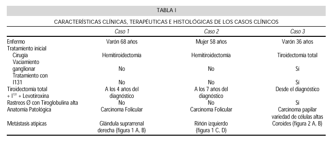 Se han revisado los CDT diagnosticados en nuestro hospital desde enero de 1988 a marzo de 1999, identificando tres casos con metástasis en lugares poco habituales, al nivel de glándula suprarrenal, riñón y coroides ocular. Se analizan las características clínicas, estadio de DeGroot al diagnóstico (8), variedad histológica y tratamiento aplicado (Tabla I).