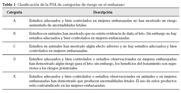 Respecto a los fármacos se establecen cinco categorías, para indicar el nivel de riesgo que poseen sobre el feto (Tabla 1):