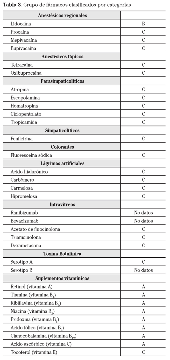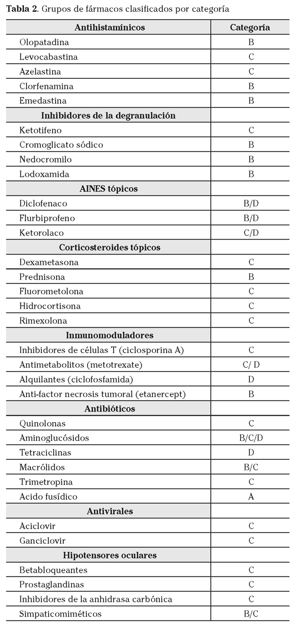 Se realiza una revisión de los fármacos oculares según las categorías de riesgo fetal propuestas por la clasificación de la Food and Drug Administration (FDA). Se evalúan los fármacos de elección en las patologías oculares más frecuentes, así como los fármacos que deben evitarse.