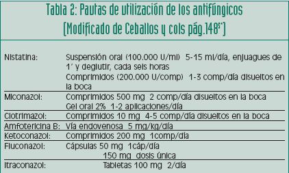 Indicaremos tratamiento antifúngico cuando el paciente refiera una clínica de dolor o sensación de ardor, o bien exista riesgo de infección faríngea o sistémica1** y se tiene que alargar cuatro semanas. Las pautas de tratamiento de los diferentes antifúngicos se presentan en la tabla 2.