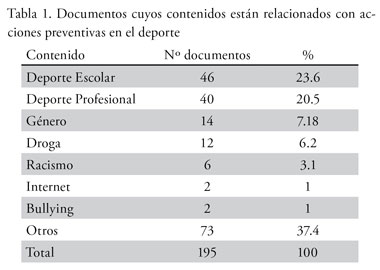 Para la identificación de los documentos, el 9 de abril de 2011, se consultaron cuatro bases de datos (Sportdiscus, Psicodoc, Psycinfo y Dialnet). Sin embargo, aunque se ha llevado a cabo una búsqueda detallada en las bases de datos señaladas, se ha recurrido también a otras fuentes (libros de actas, tesis doctorales, páginas web, informes), ya que aportan información relevante sobre acciones preventivas de la violencia en el deporte que no aparecen en las bases de datos. Entre las temáticas que recogen las bases de datos revisadas, se ha llevado a cabo una búsqueda de aquellos contenidos bibliográficos relacionados específicamente con actuaciones de prevención de comportamientos violentos en contextos deportivos en edad escolar. La búsqueda en las bases de datos, se ha realizado en la opción "cualquier campo". El motivo es porque delimitando la búsqueda en campos concretos (eg. por título, palabras clave o resumen), se reduce sobremanera el número de documentos, dejando de aparecer algunos que son citados en el presente artículo. Los descriptores utilizados en la búsqueda han sido en Sportdiscus y Psycinfo: prevention* and violence* and sport* y en Dialnet y Psicodoc: prevención* y violencia* y deporte*. Por el número de documentos encontrados, atendiendo a la casuística de cada base de datos, para garantizar una óptima revisión bibliográfica sobre el objeto de estudio, se ha acotado la búsqueda en Psyquinfo, desde el año 1996 hasta el 2011, y en Sport Discus de diciembre de 1996 a enero de 2011. De la misma manera, tanto Dialnet como Psicodoc no permiten delimitar el período temporal, por lo que a partir de los descriptores señalados, se han recogido los escasos documentos encontrados en cada una de ellas. Los documentos hallados fueron 263 (179 en Sportdiscus, 16 en Dialnet, 61 en Psycinfo y 7 en Psicodoc). Entre los 263 documentos encontrados, se han hallado 68 duplicados. Por tanto, han sido 195 los documentos analizados.