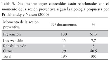 En la Tabla 3 se muestra el número de documentos y el porcentaje de las estrategias utilizadas atendiendo al momento de la acción preventiva (Prilleltensky y Nelson, 2000).