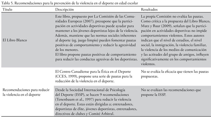 Son escasos los documentos hallados que propongan sugerencias para la reducción de la violencia en el deporte (ver Tabla 5).