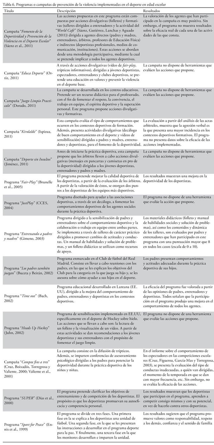 Los programas y campañas de prevención son las predominantes en los documentos revisados. En los contextos deportivos en edad escolar, desde organismos gubernamentales, asociaciones, federaciones deportivas o clubes deportivos, se implementan programas o campañas divulgativas, de concienciación para la prevención de la violencia y el fomento de la deportividad (ver Tabla 6).