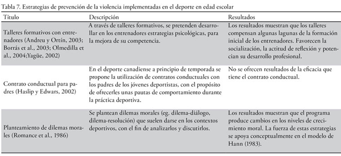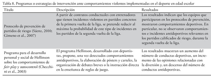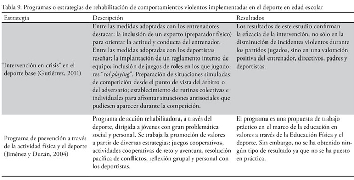 De la misma manera, se han implementado programas o estrategias de intervención o rehabilitación en los contextos deportivos en edad escolar. Las primeras (ver Tabla 8), se dirigen a corregir actitudes y conductas no deseadas en un estado inicial.