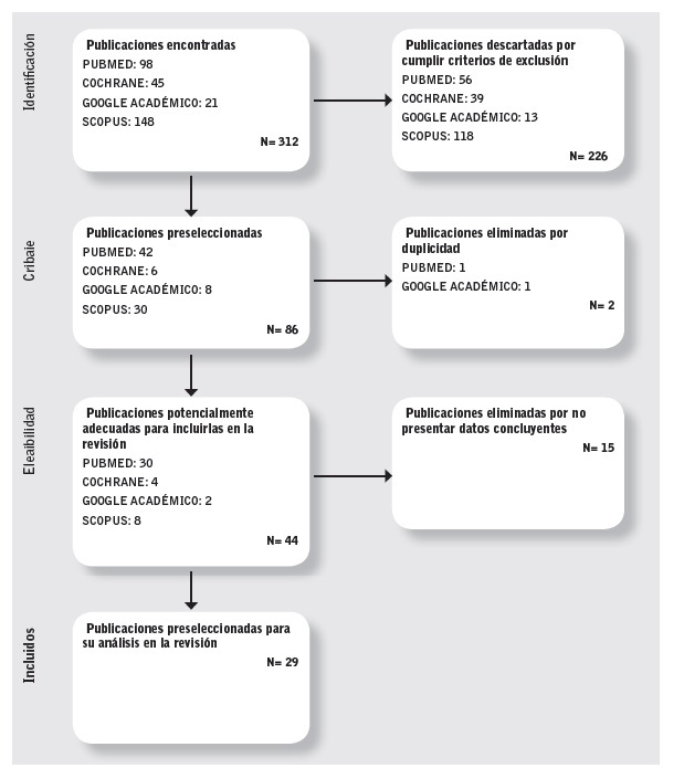 Para realizar la revisión sistemática se siguieron las recomendaciones de la revisión PRISMA13, cuya creación ha surgido con el fin de mejorar la claridad, la trasparencia y el desarrollo homogéneo de las revisiones sistemáticas.