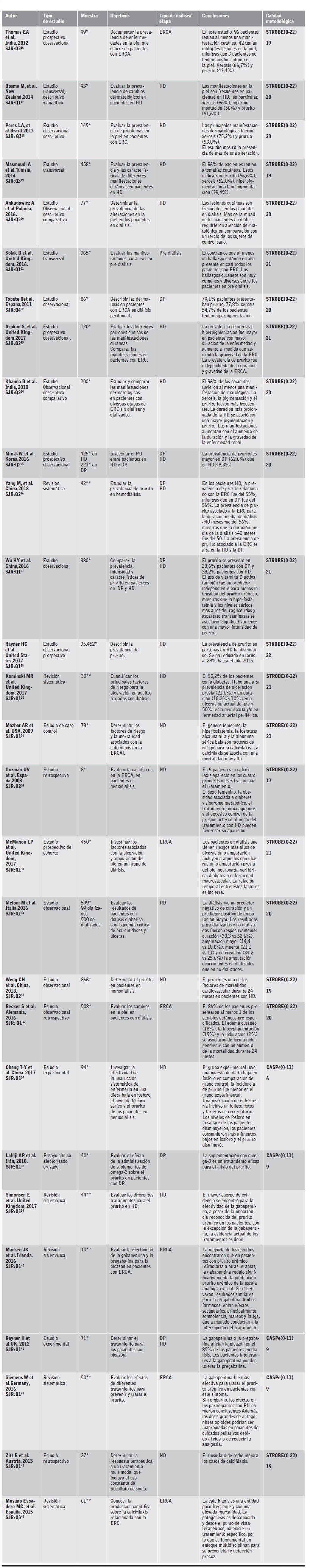 De los cinco estudios que analizan el prurito en diálisis, el 40 % de los estudios analizados, el prurito prevalece en la DP25, 26. Mientras que en HD, el 60% de los estudios, sugieren que el prurito es la principal alteración19, 26, 27.